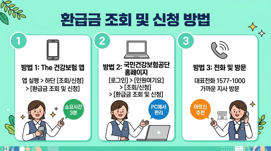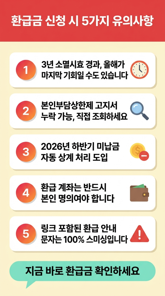 ⑤ 스미싱 주의: “건강보험 환급금이 있습니다. 링크를 클릭하세요”라는 문자는 99% 스미싱(사기 문자)입니다. 건보공단은 링크가 포함된 환급 안내 문자를 보내지 않습니다. 반드시 The건강보험 앱이나 공식 홈페이지에서 직접 조회하세요.