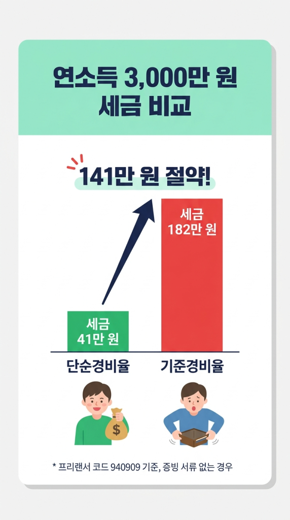 같은 3,000만 원 수입인데 단순경비율이냐 기준경비율이냐에 따라 세금이 4배 이상 차이 나는 셈입니다. 2025년 수입이 3,600만 원 미만이라면 올해부터 단순경비율을 적용받을 수 있으니, 5월 신고 전에 반드시 본인의 유형을 확인하세요.