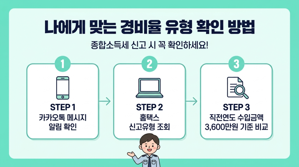 둘째, 국세청 안내문 확인입니다. 4월 말~5월 초에 카카오톡 또는 문자로 “○○님의 종합소득세 신고 유형은 E유형입니다” 같은 안내가 옵니다. 여기에 적힌 유형이 곧 본인의 경비율 적용 기준입니다.