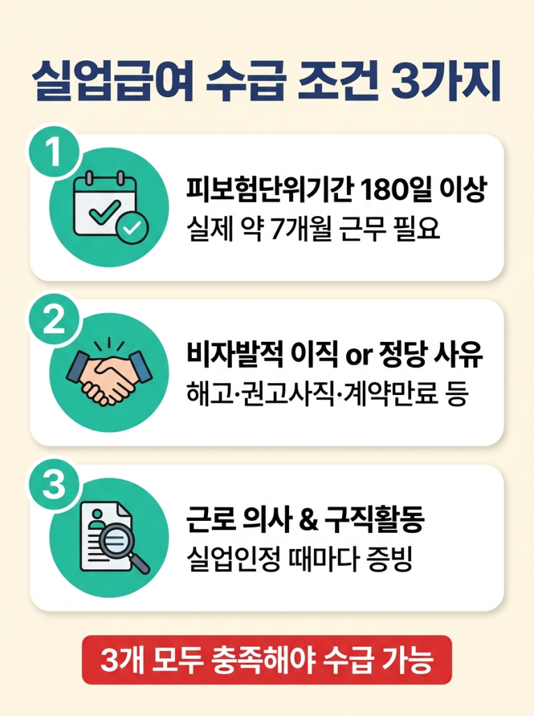 실업급여를 받으려면 아래 세 가지 조건을 동시에 충족해야 합니다.