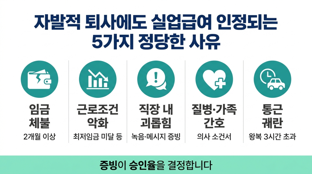 원칙적으로 자발적 퇴사는 실업급여 대상이 아니지만, 고용보험법은 아래와 같은 정당한 사유를 인정합니다.