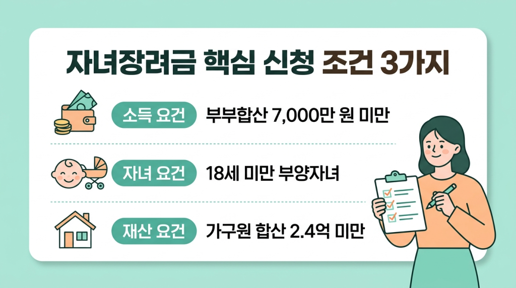 자녀장려금을 받으려면 소득 요건, 자녀 요건, 재산 요건 세 가지를 모두 충족해야 합니다.
