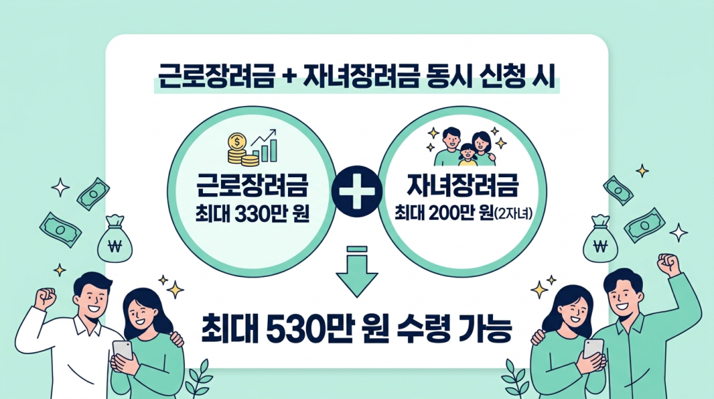 최대 수령 시나리오를 정리하면 이렇습니다. 맞벌이 가구이고 자녀가 2명이라면, 근로장려금 최대 330만 원 + 자녀장려금 최대 200만 원(100만 원 × 2명) = 총 530만 원까지 수령이 가능합니다.